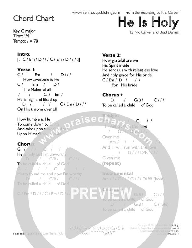 Download the PDF Chord Charts for He Is Holy by Nic Carver, from the album Spring Collection.