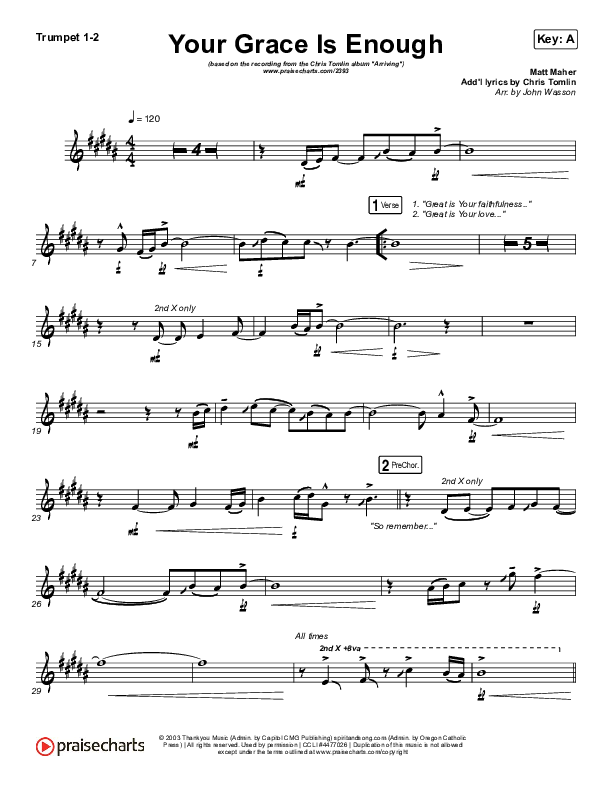 Download the Orchestration brass parts for Your Grace Is Enough by Chris Tomlin, from the album Arriving. This song was arranged by John Wasson in the key of A, Ab, F, G.