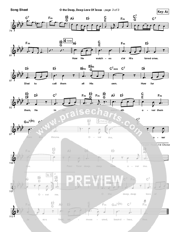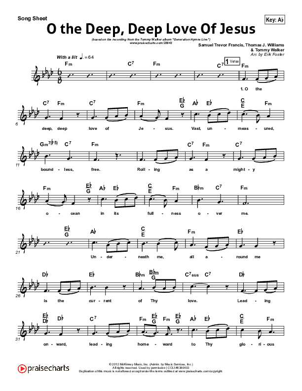 Download the sheet music for O The Deep Deep Love Of Jesus by Tommy Walker, from the album Generation Hymns Live. This song was arranged by Erik Foster in the key of Ab, G.