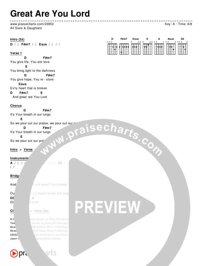 Download the PDF Chord Charts for Great Are You Lord by All Sons & Daughters, from the album All Sons & Daughters Live. This song was arranged by Daniel Galbraith in the key of A, Ab, B, Bb, D, E, Eb, F, G.