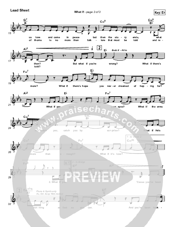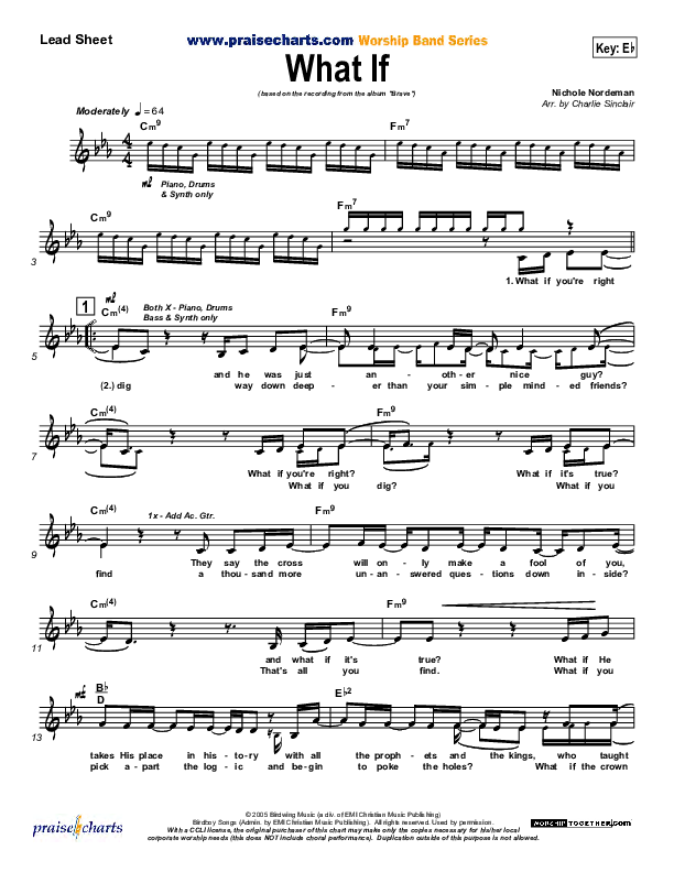 Download the sheet music for What If by Nichole Nordeman, from the album Brave. This song was arranged by Charlie Sinclair in the key of Eb, F.
