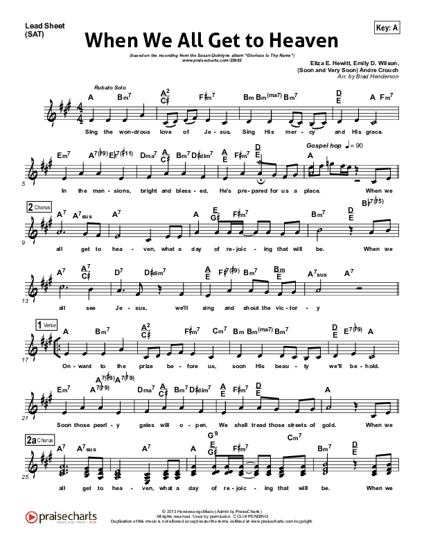 Download the sheet music for When We All Get To Heaven by Susan Quintyne, from the album Glorious Is Thy Name. This song was arranged by Brad Henderson in the key of A, G.