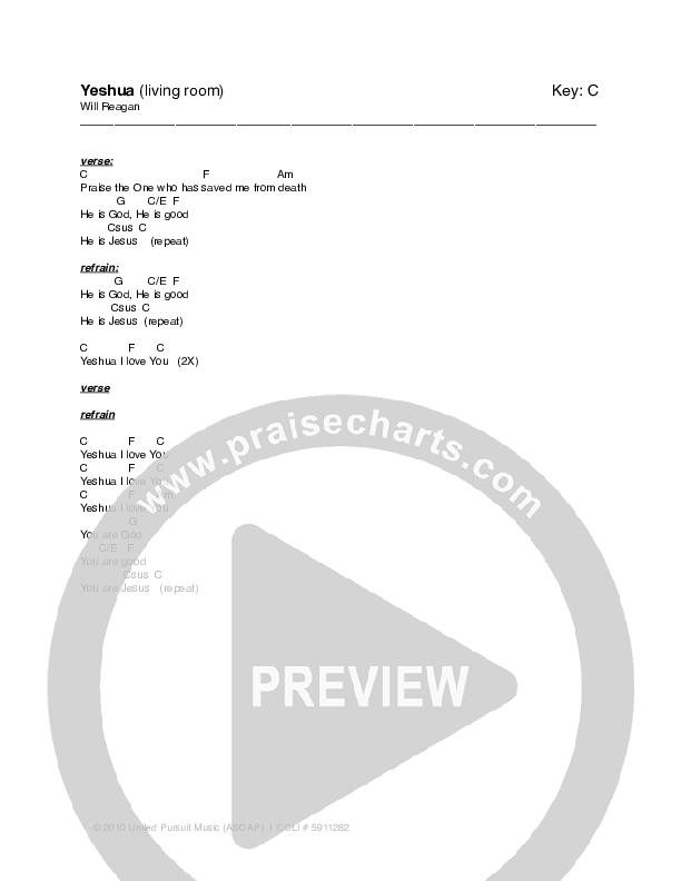Download the PDF Chord Charts for Yeshua by Will Reagan / United Pursuit, from the album Live At The Banks House.