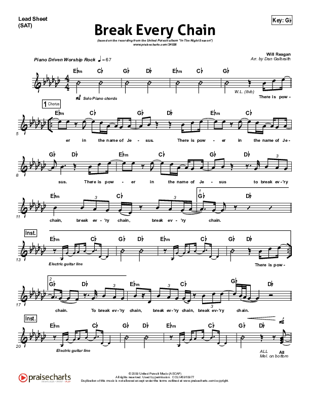 Download the sheet music for Break Every Chain by Will Reagan / United Pursuit, from the album In The Night Season. This song was arranged by Daniel Galbraith in the key of F, Gb.