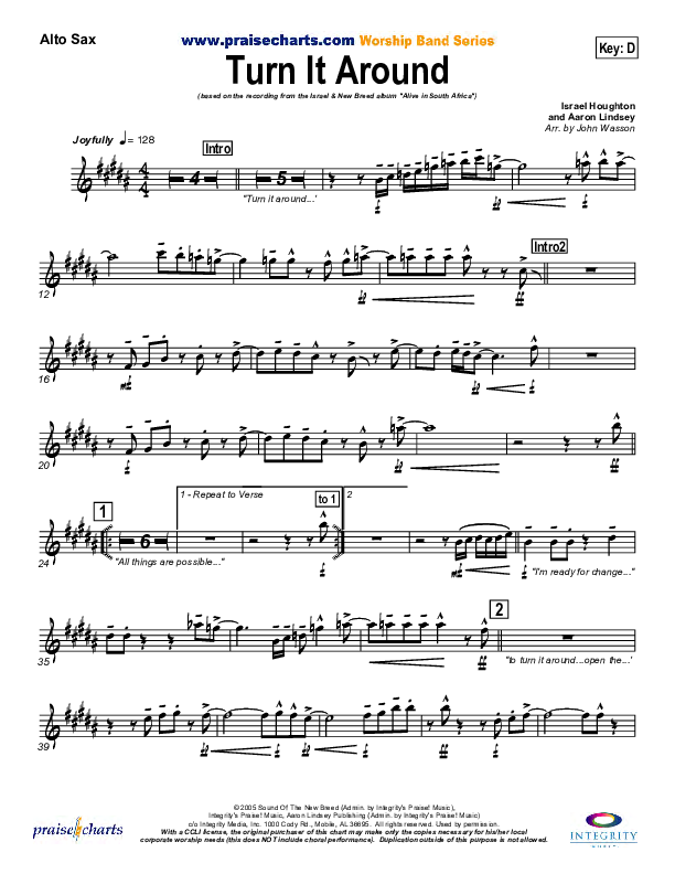 Download the AltoSax sheet music for Turn It Around by Israel Houghton, from the album Alive in South Africa. This song was arranged by John Wasson in the key of D, Eb.