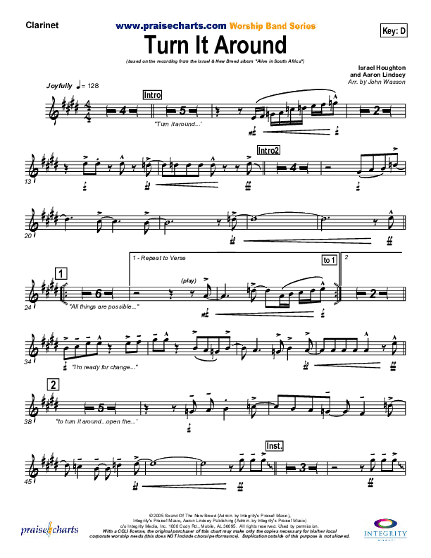 Download the Orchestration for Turn It Around by Israel Houghton, from the album Alive in South Africa. This song was arranged by John Wasson in the key of D, Eb.
