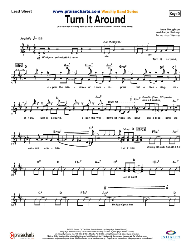 Download the Orchestration for Turn It Around by Israel Houghton, from the album Alive in South Africa. This song was arranged by John Wasson in the key of D, Eb.