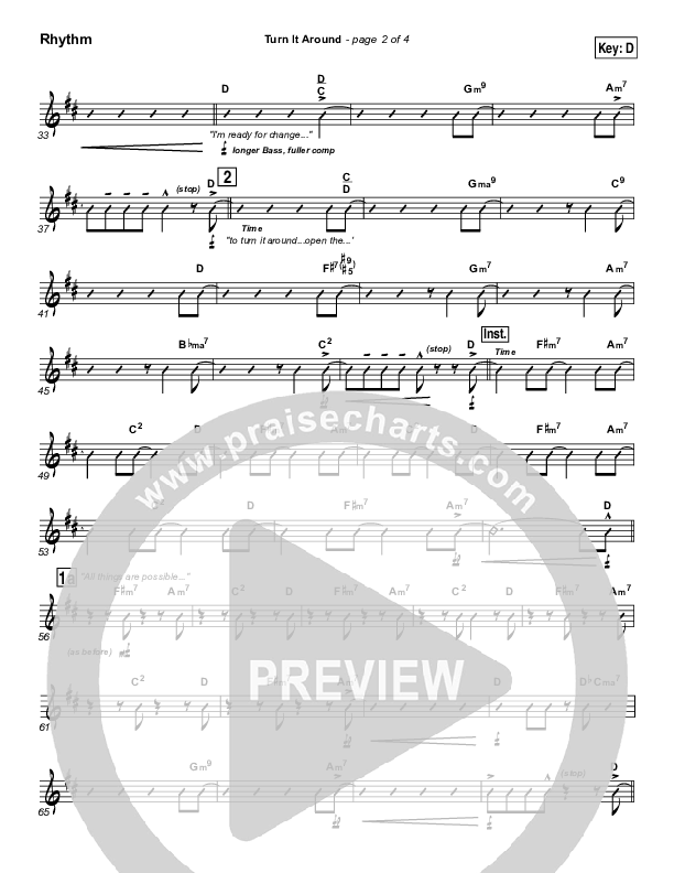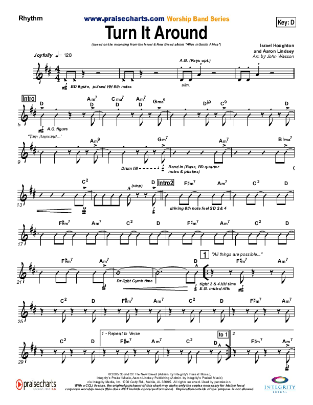Download the Rhythm Chart for Turn It Around by Israel Houghton, from the album Alive in South Africa. This song was arranged by John Wasson in the key of D, Eb.
