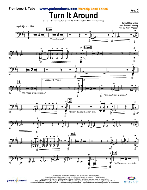 Download the Trombone 3/Tuba sheet music for Turn It Around by Israel Houghton, from the album Alive in South Africa. This song was arranged by John Wasson in the key of D, Eb.