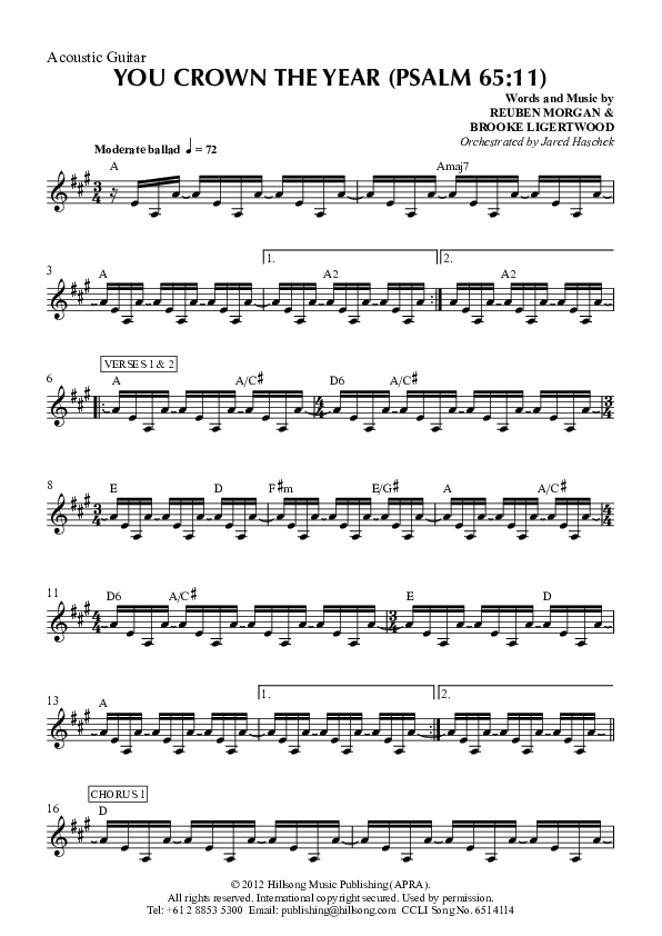Download the Acoustic Guitar sheet music for You Crown The Year by Hillsong Worship, from the album Glorious Ruins. This song was arranged by Hillsong Charts in the key of A.