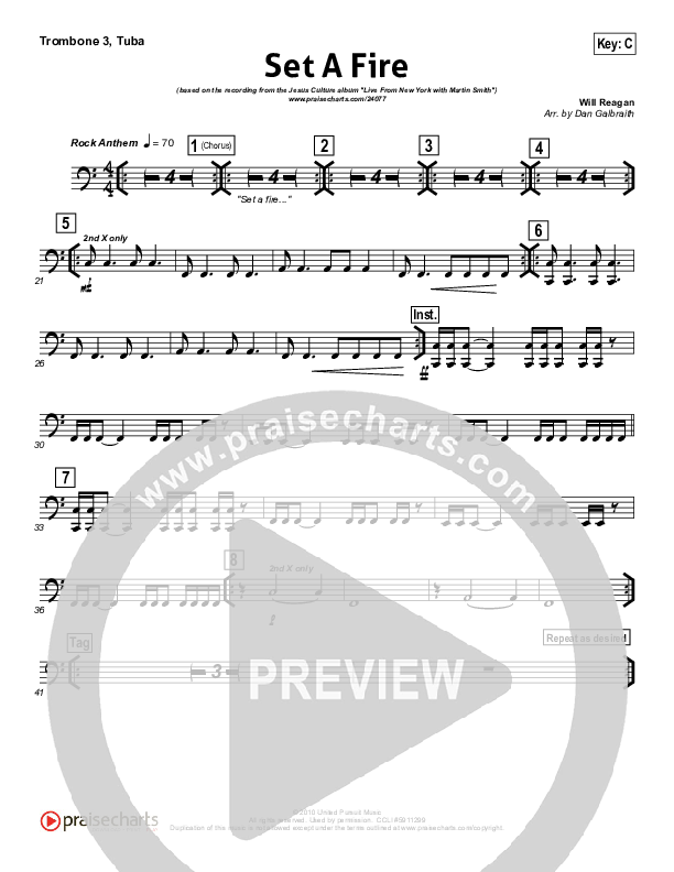 Download the Trombone 3/Tuba sheet music for Set A Fire by Martin Smith / Jesus Culture, from the album Live From New York (with Martin Smith). This song was arranged by Daniel Galbraith in the key of Bb, C.