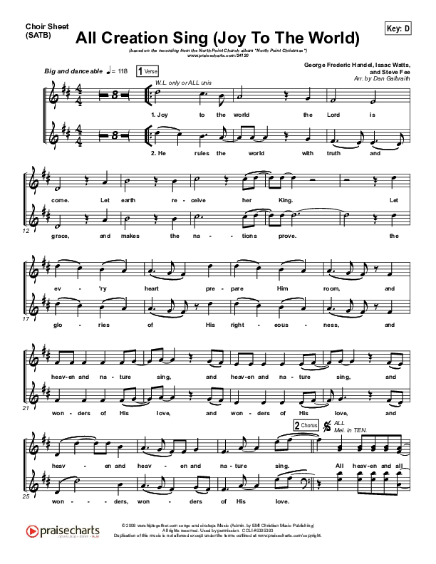 Download the Choir Sheet for All Creation Sing (Joy To The World) by Seth Condrey / North Point Worship, from the album North Point Christmas. This song was arranged by Daniel Galbraith in the key of B, Bb, C, D, E, Eb.