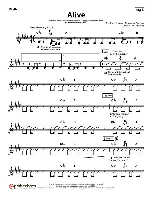 Download the Rhythm Chart for Alive by Hillsong Young & Free, from the album We Are. This song was arranged by Daniel Galbraith in the key of C, D, E, Eb.