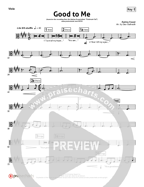 Download the Viola sheet music for Good To Me by Audrey Assad, from the album Fortunate Fall. This song was arranged by Daniel Galbraith in the key of E, F.