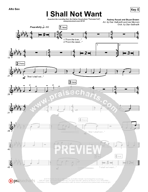 Download the AltoSax sheet music for I Shall Not Want by Audrey Assad, from the album Fortunate Fall. This song was arranged by Lee Marcum / Daniel Galbraith in the key of E, F.