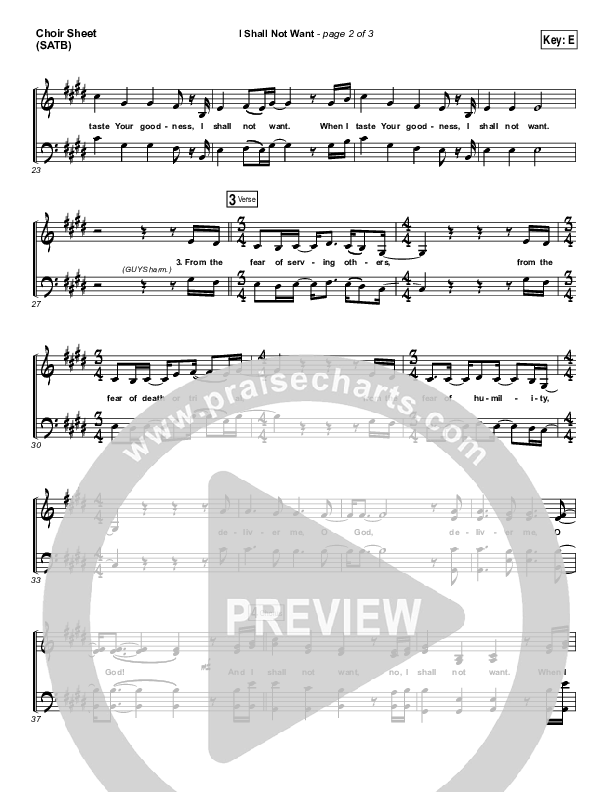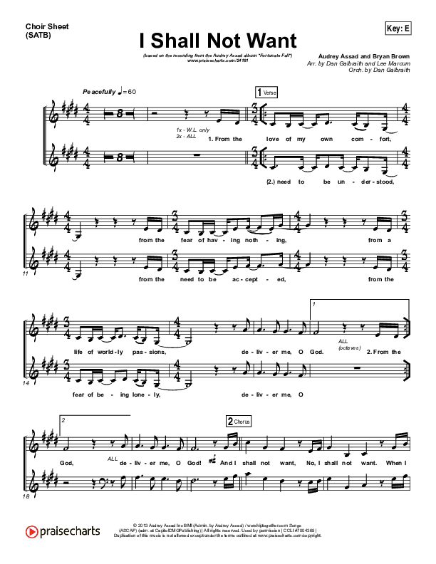 Download the Choir Sheet for I Shall Not Want by Audrey Assad, from the album Fortunate Fall. This song was arranged by Lee Marcum / Daniel Galbraith in the key of E, F.
