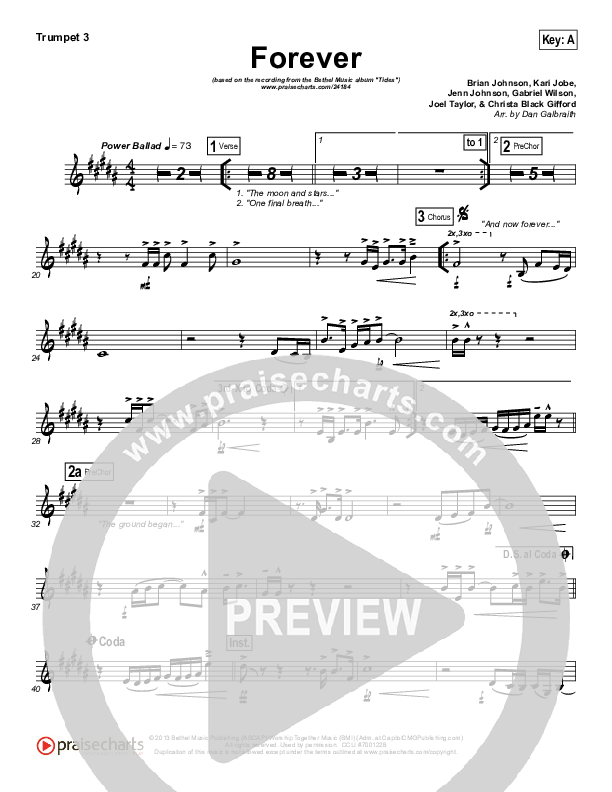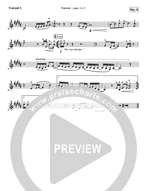 Download the Trumpet 3 sheet music for Forever by Bethel Music / Brian Johnson, from the album Tides. This song was arranged by Daniel Galbraith in the key of A, Bb.