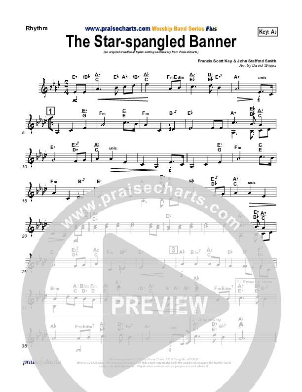 Download the Rhythm Chart for The Star-Spangled Banner by PraiseCharts / Traditional Hymn, from the album Traditional Hymns Collection. This song was arranged by David Shipps in the key of Ab, Bb.