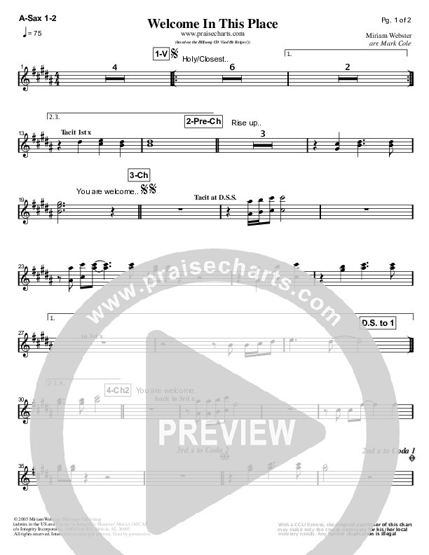 Download the AltoSax sheet music for Welcome In This Place by Hillsong Worship, from the album God He Reigns. This song was arranged by Mark Cole in the key of C, D.