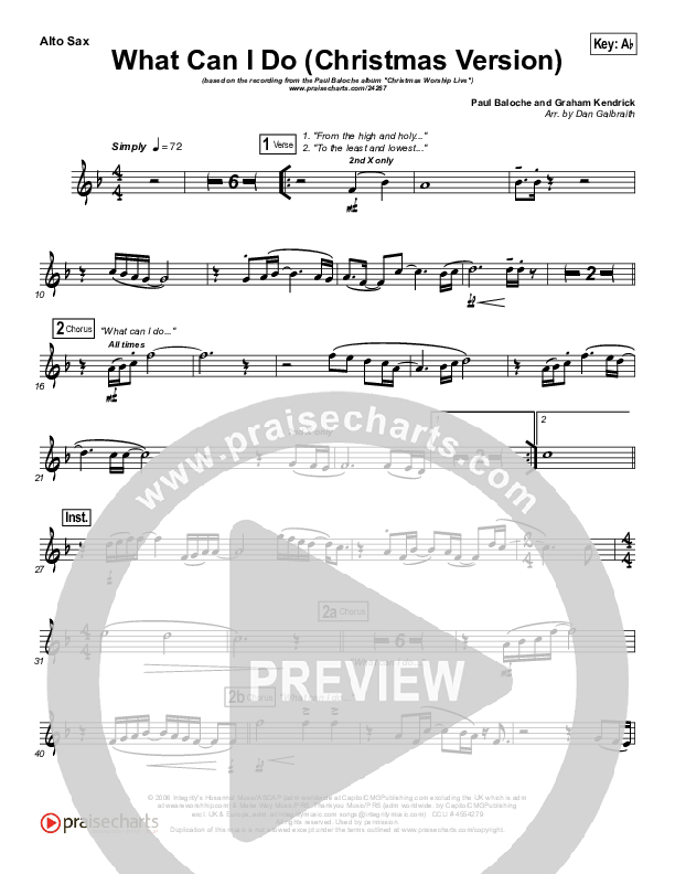 Download the AltoSax sheet music for What Can I Do (Christmas) by Paul Baloche, from the album Christmas Worship. This song was arranged by Daniel Galbraith in the key of Ab, G.