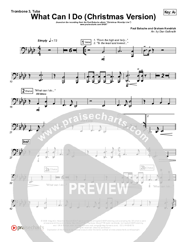 Download the Trombone 3/Tuba sheet music for What Can I Do (Christmas) by Paul Baloche, from the album Christmas Worship. This song was arranged by Daniel Galbraith in the key of Ab, G.