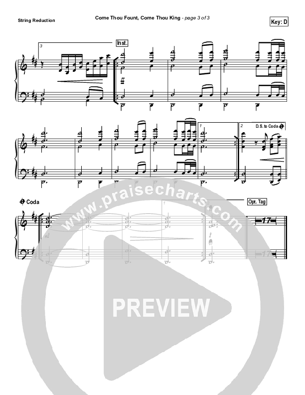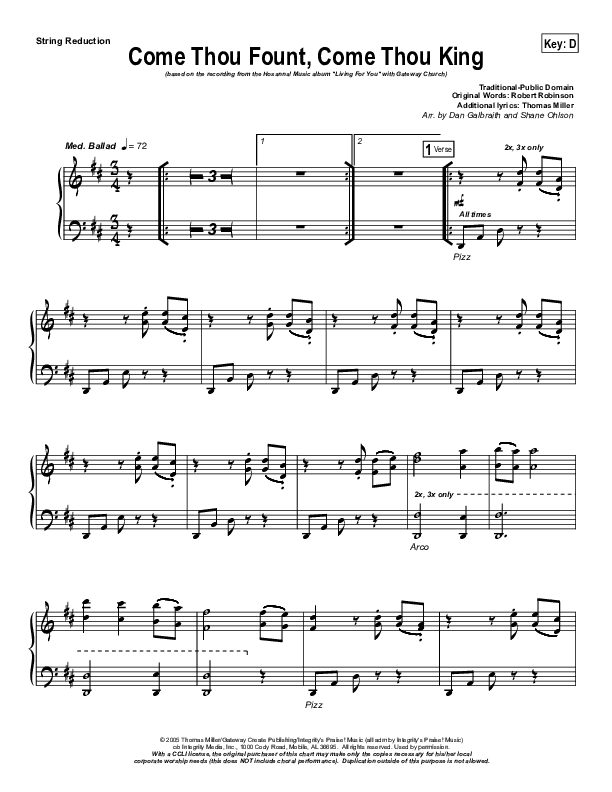 Download the String Reduction sheet music for Come Thou Fount Come Thou King by Gateway Worship, from the album Living For You. This song was arranged by Daniel Galbraith in the key of C, D.