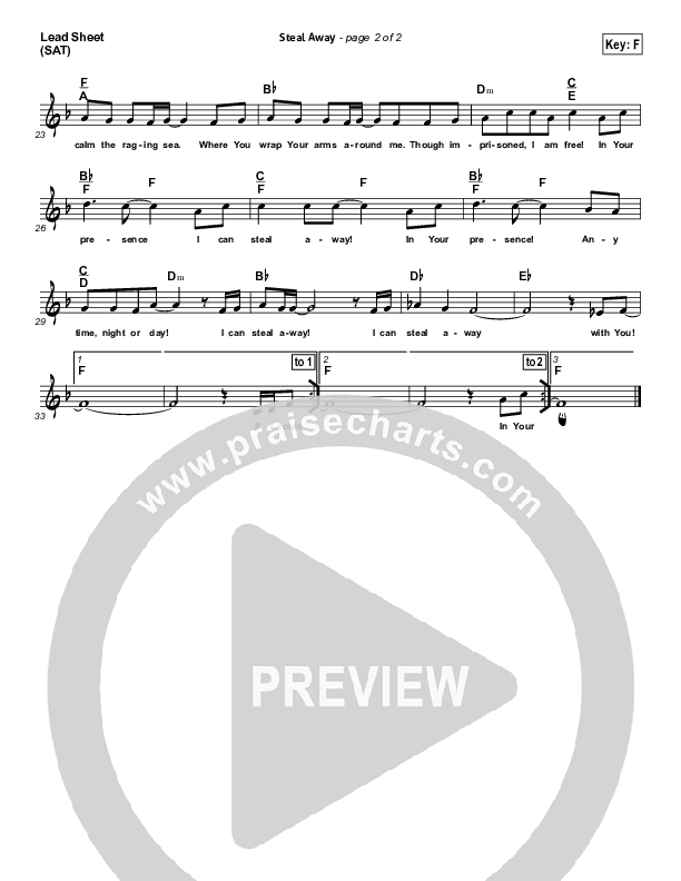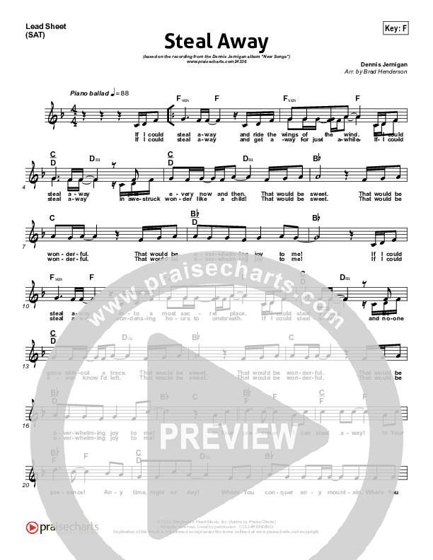 Download the sheet music for Steal Away by Dennis Jernigan, from the album New Songs. This song was arranged by Brad Henderson in the key of F, G.
