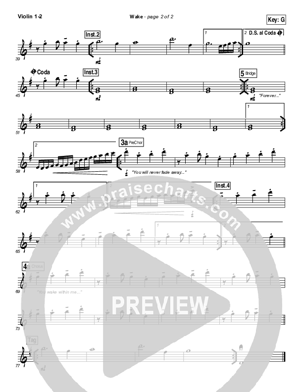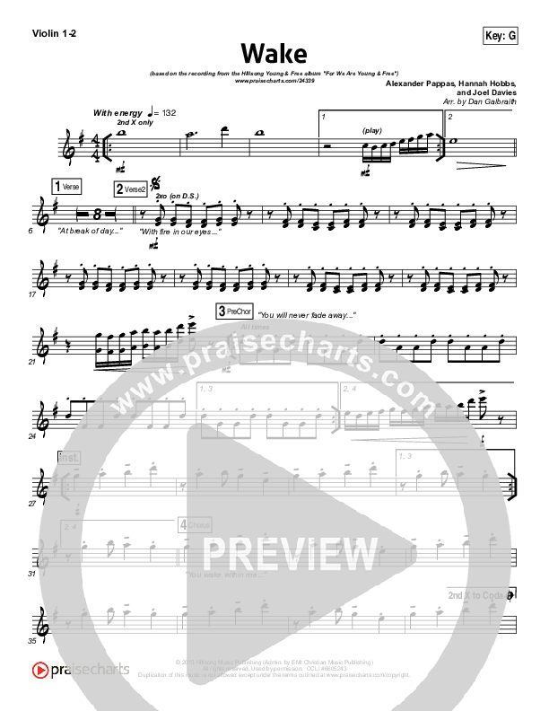 Download the Violin sheet music for Wake by Hillsong Young & Free, from the album We Are. This song was arranged by Daniel Galbraith in the key of A, G.