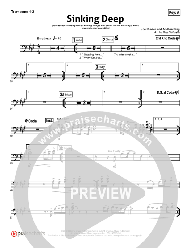 Download the Trombone 1,2 sheet music for Sinking Deep by Hillsong Young & Free, from the album We Are. This song was arranged by Daniel Galbraith in the key of A, Ab.