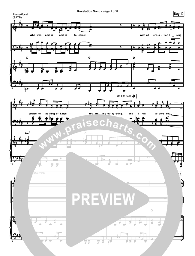 Download the sheet music for Revelation Song by Gateway Worship, from the album Living For You. This song was arranged by Daniel Galbraith in the key of D, Eb.