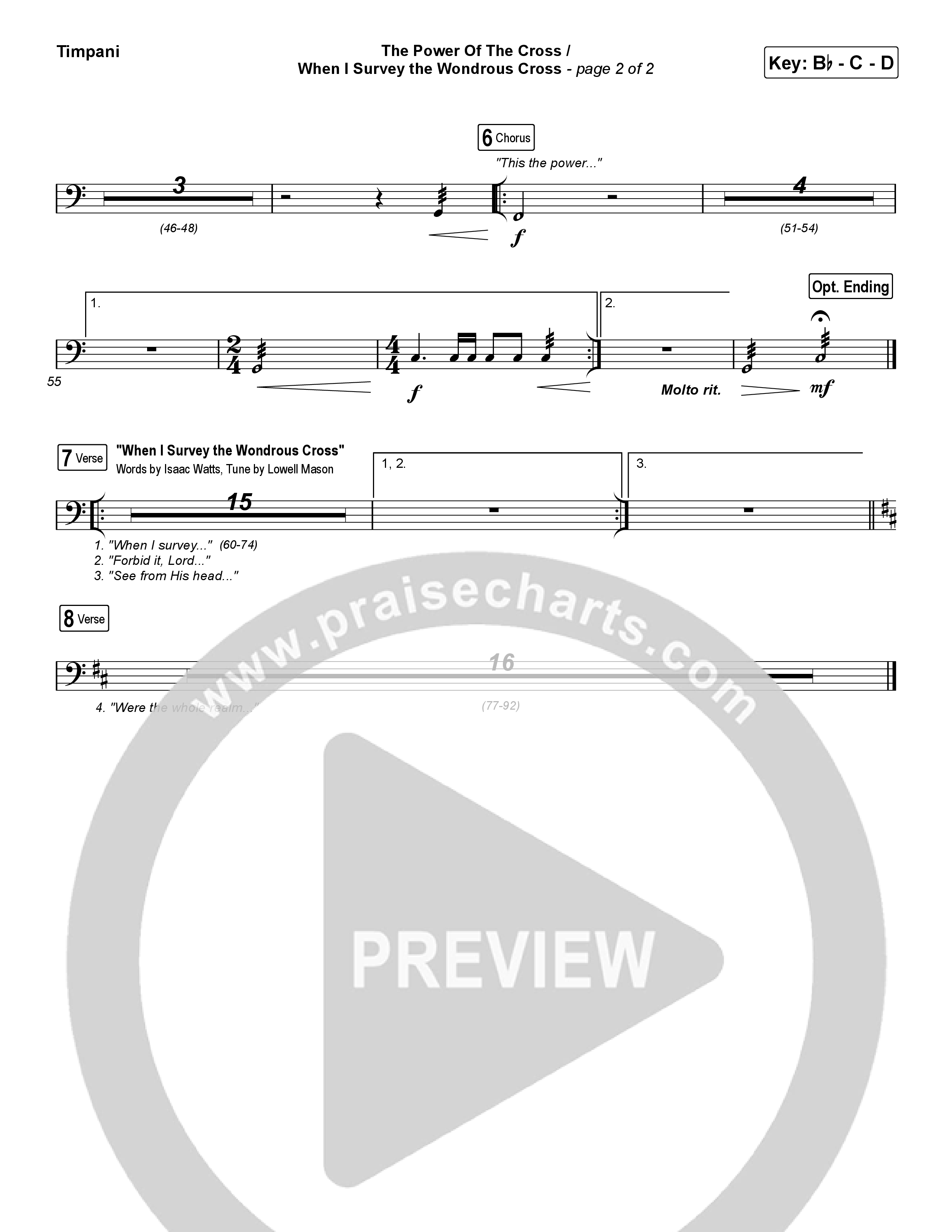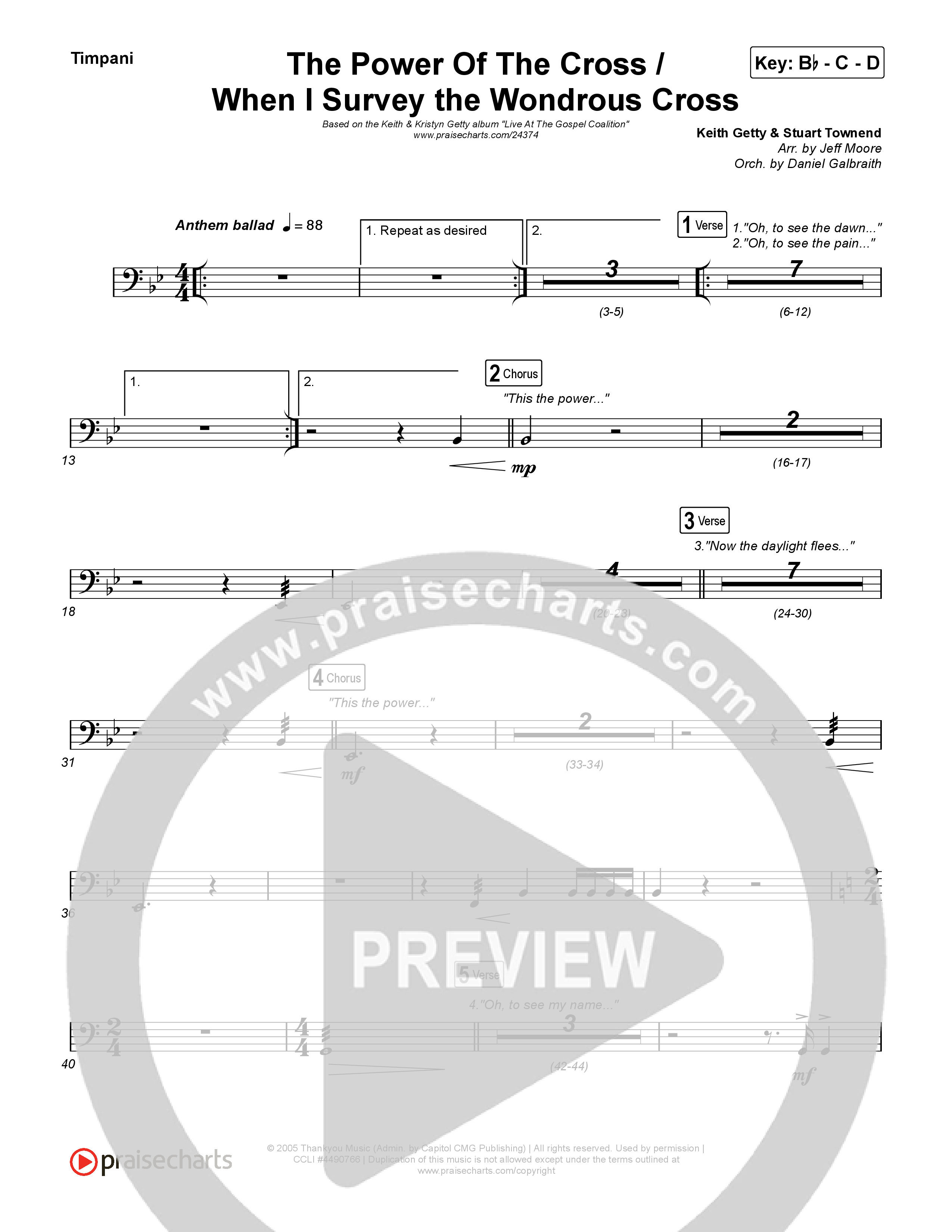 Download the Timpani sheet music for The Power Of The Cross/When I Survey The Wondrous Cross by Keith & Kristyn Getty, from the album Live At The Gospel Coalition. This song was arranged by Jeff Moore in the key of Bb.
