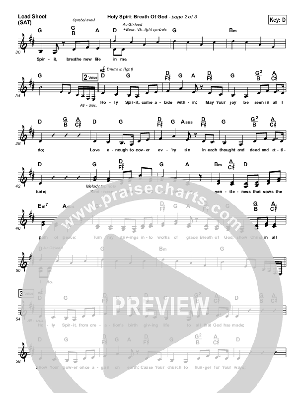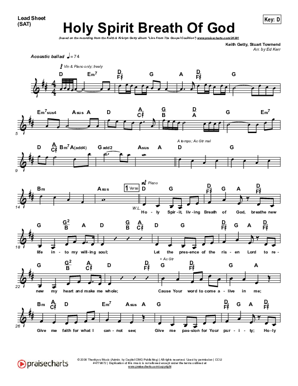 Download the sheet music for Holy Spirit Breath Of God by Keith & Kristyn Getty, from the album Live At The Gospel Coalition. This song was arranged by Ed Kerr in the key of D, E.