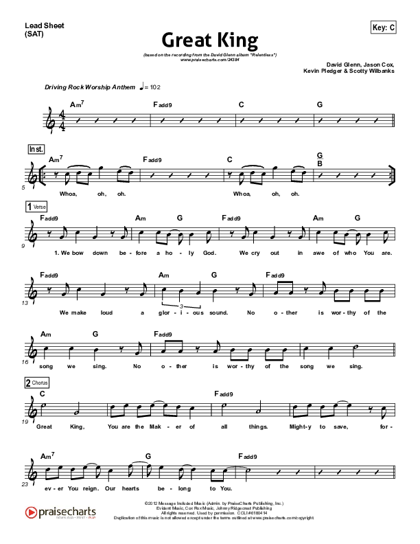 Download the sheet music for Great King by David Glenn, from the album Relentless.