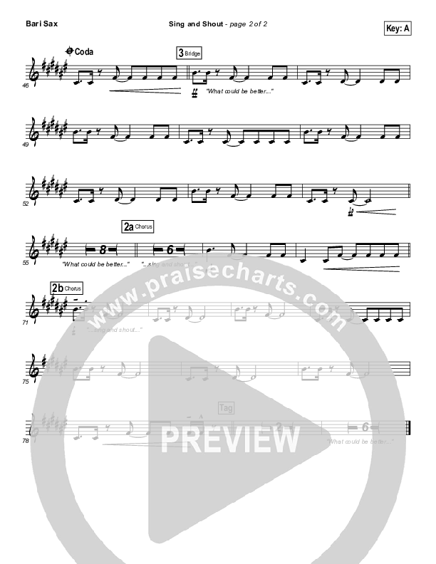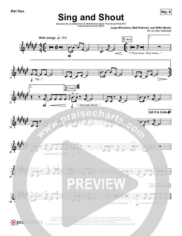 Download the Bari Sax sheet music for Sing And Shout by Matt Redman, from the album Your Grace Finds Me. This song was arranged by Daniel Galbraith in the key of A, G.