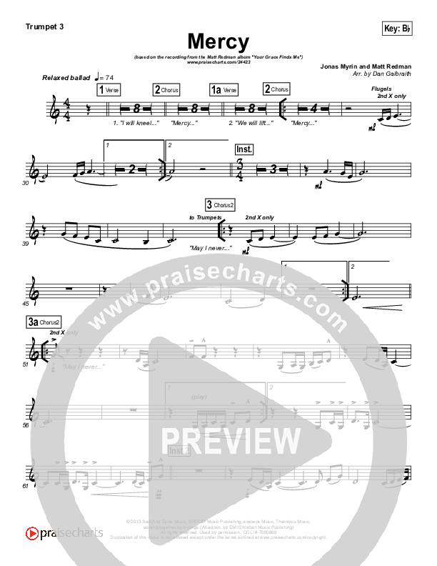 Download the Trumpet 3 sheet music for Mercy by Matt Redman, from the album Your Grace Finds Me. This song was arranged by Daniel Galbraith in the key of Bb, C.