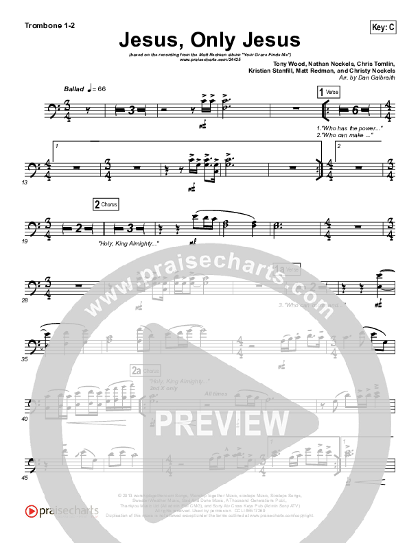 Download the Trombone 1,2 sheet music for Jesus Only Jesus by Matt Redman, from the album Your Grace Finds Me. This song was arranged by Daniel Galbraith in the key of Bb, C.