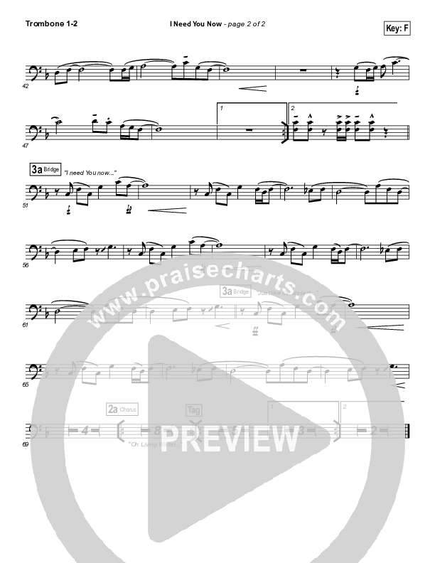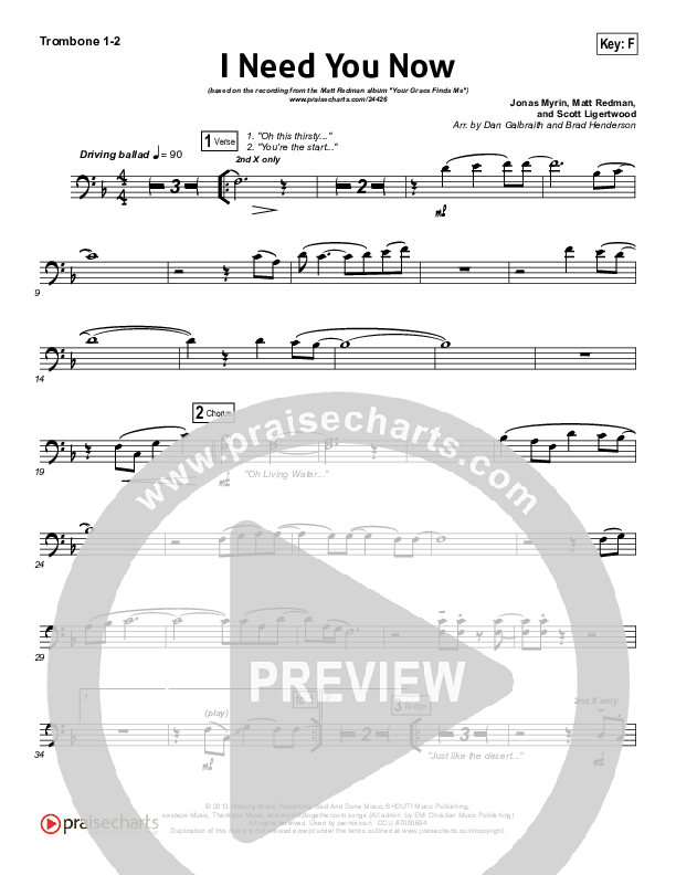 Download the Trombone 1,2 sheet music for I Need You Now by Matt Redman, from the album Your Grace Finds Me. This song was arranged by Daniel Galbraith / Brad Henderson in the key of F, G.