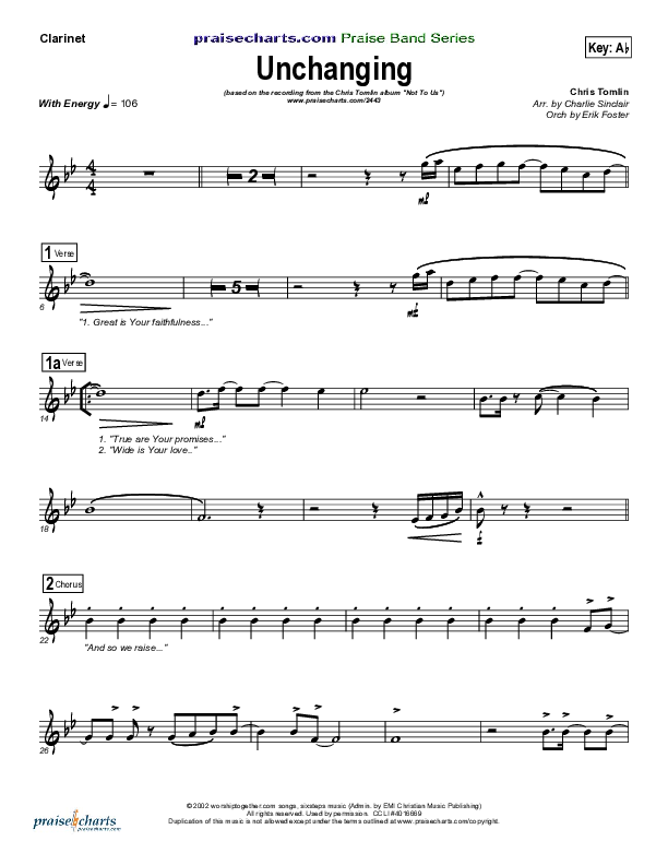 Download the Orchestration for Unchanging by Chris Tomlin, from the album Not To Us. This song was arranged by Erik Foster / Charlie Sinclair in the key of Ab, F.