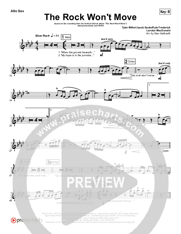 Download the AltoSax sheet music for The Rock Won't Move by Vertical Worship, from the album The Rock Won't Move. This song was arranged by Daniel Galbraith in the key of A, B, Bb.