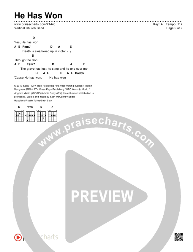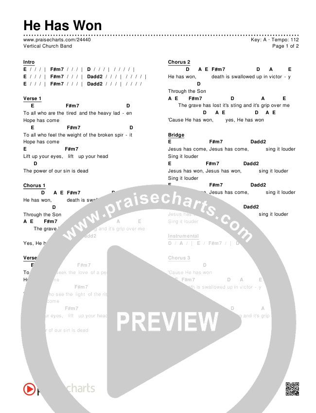 Download the PDF Chord Charts for He Has Won by Vertical Worship, from the album The Rock Won't Move. This song was arranged by Dave Iula in the key of A, Ab.
