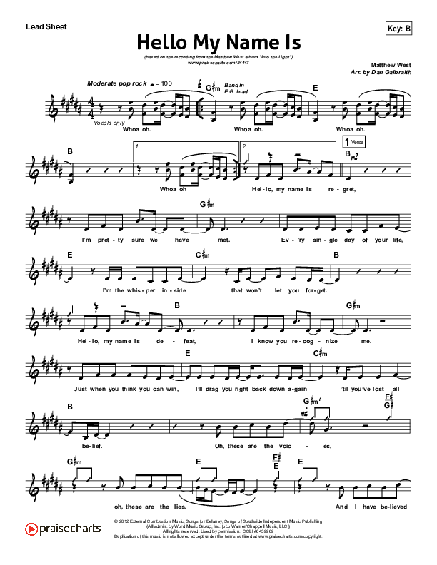 Download the Orchestration for Hello My Name Is by Matthew West, from the album Into The Light. This song was arranged by Daniel Galbraith in the key of B, Bb.