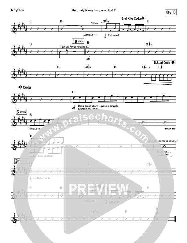 Download the Rhythm Chart for Hello My Name Is by Matthew West, from the album Into The Light. This song was arranged by Daniel Galbraith in the key of B, Bb.