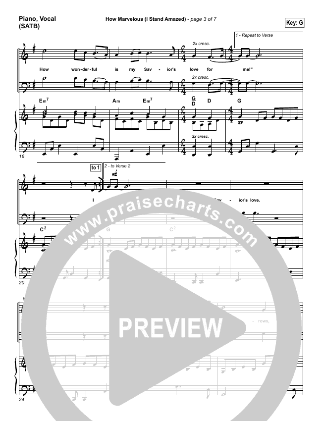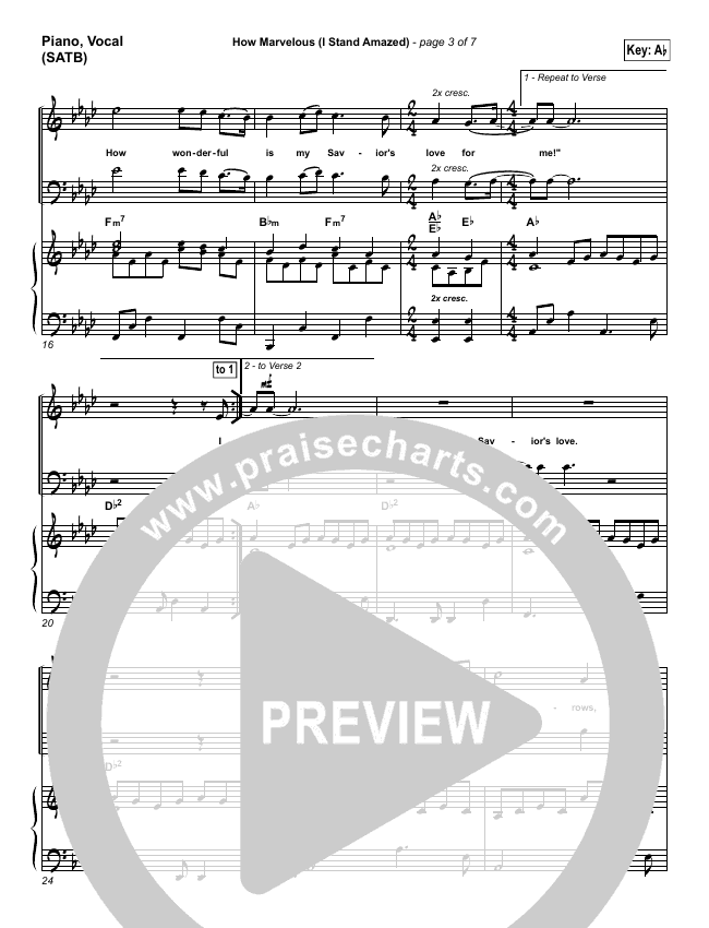 Download the sheet music for How Marvelous (I Stand Amazed) by Chris Tomlin / Passion, from the album Passion: Everything Glorious. This song was arranged by John Wasson in the key of Ab, F, G.