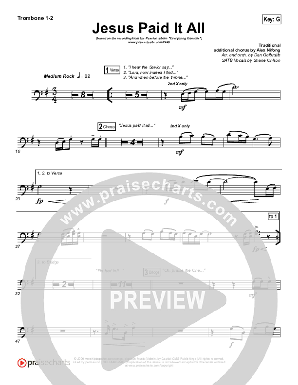 Download the Trombone 1,2 sheet music for Jesus Paid It All by Kristian Stanfill / Passion, from the album Passion: Everything Glorious. This song was arranged by Daniel Galbraith in the key of A, B, G.