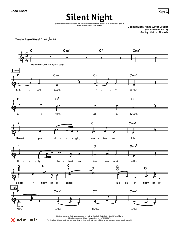 Download the sheet music for Silent Night by North Point Worship, from the album Let There Be Light. This song was arranged by Nathan Nockels in the key of D, F.