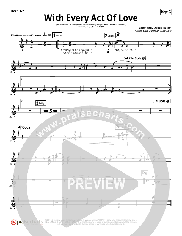 Download the French Horn sheet music for With Every Act Of Love by Jason Gray, from the album WIth Every Act Of Love. This song was arranged by Daniel Galbraith in the key of Bb, C.