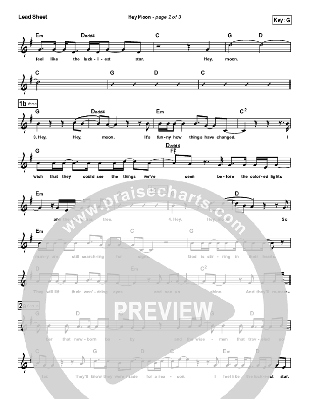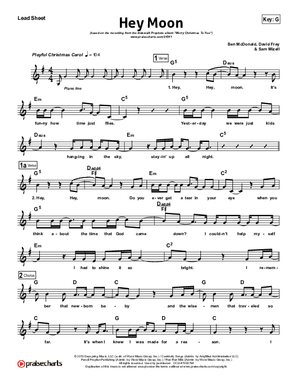 Download the sheet music for Hey Moon by Sidewalk Prophets, from the album Merry Christmas To You. This song was arranged by Dave Iula / Brad Henderson in the key of F, G.