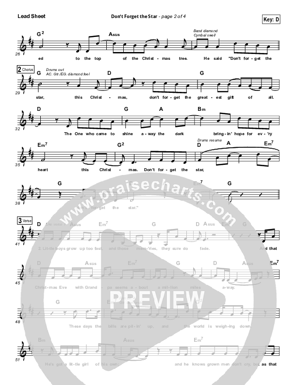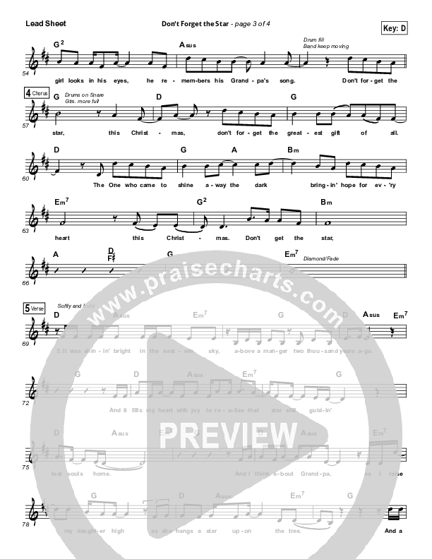 Download the sheet music for Don't Forget The Star by Sidewalk Prophets, from the album Merry Christmas To You. This song was arranged by Lee Marcum in the key of D, E.