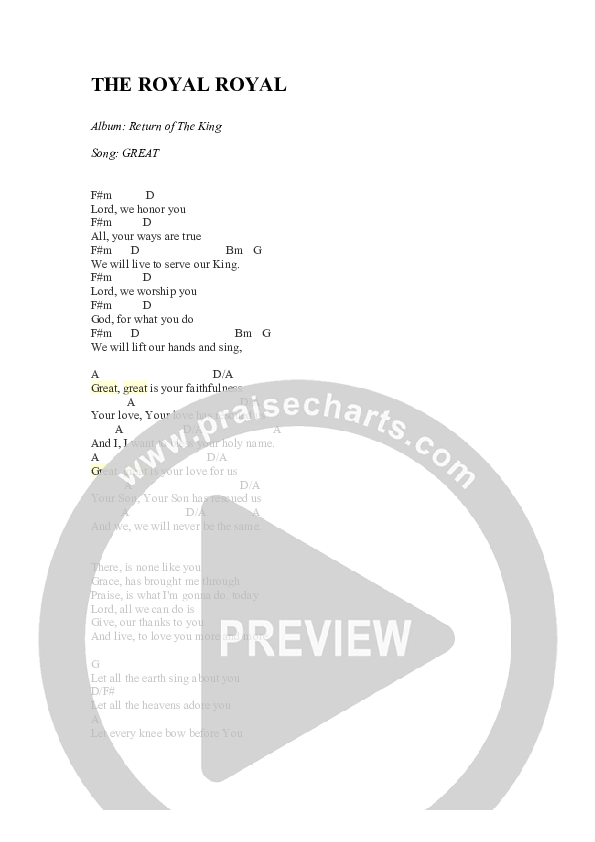 Download the PDF Chord Charts for Great by The Royal Royal, from the album The Return Of The King.