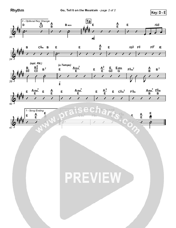 Download the Rhythm Chart for Go Tell It On The Mountain by Traditional Carol / PraiseCharts, from the album Traditional Carols Collection. This song was arranged by David Shipps in the key of D, Eb.